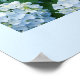 Poster mostrado con una foto impresa de hortensias azules de bonito y con un fondo azul claro. Personalizar este artículo o compra tal cual.