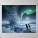 A pair of penguins stand on icy terrain near a frost-covered ship. The vibrant green aurora borealis illuminates the night sky.