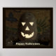 Las papas sustituyen a las calabazas como calabazas de Jack O'lanterns en Idaho. Una papa, tallada e iluminada al estilo de una calabaza de Halloween, se sienta sobre un montón de espadas, montada contra un saco de falda. También aparece un texto en personalizable que dice "Feliz Halloween". Puede cambiar el tipo de letra y el color del texto.