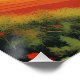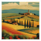La imagen representa una escena paisajística estilizada inspirada en las colinas onduladas de la Toscana. En primer plano, se han colocado unas espías rojas vibrantes y varios tonos verdes. Unas colinas suaves, representadas en un mosaico de amarillos cálidos, naranjas profundos y verduras tierra, sugieren campos agrícolas y prados. Una hilera de cipreses altos y delgados, característicos del paisaje toscano, conduce a un edificio tradicional de piedra con una torre prominente, posiblemente una casa de campo o una villa, sobre una colina. El fondo muestra más colinas entrando a lo lejos bajo un cielo suave, donde un gran sol pálido o una luna cuelgan justo encima del horizonte, arrojando una luz tranquila sobre el lugar. La obra de arte tiene una cualidad apacible, casi de ensueño, con sus colores llamativos y formas simplificadas, casi geométricas, que le dan un aspecto ligeramente abstracto o ilustrativo.