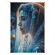 Un retrato de fantasía de primera mano de una joven tranquila y elegante de perfil mirando hacia la izquierda, iluminada por una iluminación cinematográfica doble - luz cálida que brilla hacia arriba desde abajo y luz cian fresca que cae desde arriba. Lleva un velo azul semirtransparente y brillante bordado con delicados detalles espumosos. El polvo fino purpurina la rodea, arrastrando el humo suave y curvando, lo que realza la atmósfera mística. El fondo es oscuro y monótono, con unos resplandecientes tonos que aportan profundidad y un ambiente mágico. Se presenta en detalle hiperrealista con texturas faciales nítidas, capturando una presencia serena pero encantadora y potente.