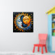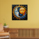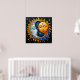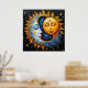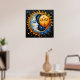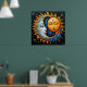 Ilustracion de un sol y una luna simbólicos entrelazados con un fondo cósmico y estrellado con colores vivos y audaces. Representa dualidad, equilibrio y armonía celestial en un estilo artístico.