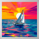 Una impresionante representación artística de un velero navegando por aguas tranquilas durante una puesta de sol vívida, mostrando colores dinámicos y elementos marítimos serenos.