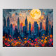 Resumen ilustracion acuático de una luna llena brillante sobre un vibrante horizonte de la ciudad por la noche. Las luces doradas de la ciudad se mezclan con el cielo azul profundo, creando una atmósfera mágica.