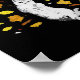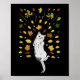 Gato blanco con hojas caídas y ilustracion de fondo negro.