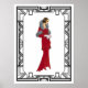 Disfruta de esta inspirada serie poster de estilo Art Déco, de modas negras y blancas de los años 20 a los 50. Este poster de moda vintage representa un dramático vestido rojo con bandas de cuello de piel y brazo. Con el desplome del mercado de valores en 1929, las líneas de cáñamo bajaron hasta la longitud de los tobillos y las líneas de cintura volvieron a su lugar natural. Una de las tendencias más importantes de la década fue el recorte de los sesgos, que creó una prenda fluida y desnatadora.