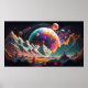 Paisaje del planeta alienígena Planeta Psicodélico Espacio plantilla de banner, fondo ilustracion horizontal del futuro con montañas, planetas, árboles, luna Escapismo Surrealista