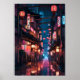 Una vibrante calle japonesa por la noche, brillando con signos de neón y farolillos, capturando una perfecta mezcla de ciberpunk y estética tradicional.