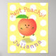 ¡Solo pavoneo! Este bonito diseño presenta nuestro alegre melocotón saltando al estilo de ilustracion personalizado sobre fondo de puntos polka amarillos.