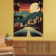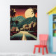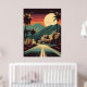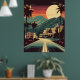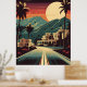 La imagen representa un ilustracion estilizado de una vista panorámica de Hollywood. La paleta de colores es cálida con un ambiente retro, con tonos naranjas, rojos, amarillos y verde azulados. En primer plano, hay un camino que conduce hacia el horizonte, marcado con líneas blancas que sugieren que el movimiento se desdibuja, dando un sentido de profundidad y movimiento. Las palmeras son símbolos emblemáticos de un clima cálido y a menudo se asocian con destinos vacacionales. En el centro se encuentran dos edificios con elementos arquitectónicos que recuerdan los estilos español o mediterráneo, como los techos de terracota, los arcos y las paredes de estuco. Al fondo, hay montañas onduladas bajo un cielo atareado, con el sol colgando bajo y alto, arrojando una luz suave sobre la escena. El ambiente general de la imagen es una escapada tranquila y exótica al atardecer. Las obras de arte podrían estar asociadas con viajes, ocio o el encanto del paraíso.