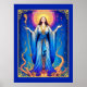 Poster en la tarjeta de tarot "La Reina de las Maravillas". Permaneciendo a regañadientes con túnicas azules, radiante bajo un halo dorado, sostiene una varita, que simboliza el poder y la creatividad. Rodeada de ramas y estrellas feroces, exuda confianza, calidez y fuerza espiritual