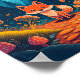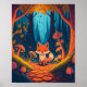 Poster colorido con un zorro en un bosque con hongos. Escena nocturna ilustracion animal con un estilo mágico y caprichoso. Decoración de pared ideal para la habitación de un niño.