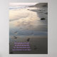 Hermosa playa de arena con olas suaves y dos pisadas que caminan una al lado de la otra. Completada con la frase "Mucha gente caminará en tu vida, pero solamente los amigos verdaderos dejarán huellas en tu corazón".