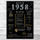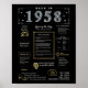 Ingrese 1958 con nuestro cautivador cartel digital de cumpleaños, repleto de datos históricos, eventos notables y relatos intrigantes del pasado. Adornado con elegantes detalles dorados y plateados sobre un fondo negro atrevido, con símbolos únicos y texto elegante, este cartel de cumpleaños emana un encanto atemporal. Ya sea que provoque conversaciones en reuniones de cumpleaños o sea apreciado como un recuerdo preciado, evoca recuerdos nostálgicos.