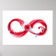 Símbolo infinito de flujo continuo de vino tinto vertiendo en vidrio de vidrio sobre fondo blanco.