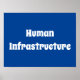 Un simple mensaje de apoyo de blanco sobre azul para infraestructura humana y mecánica. La infraestructura humana incluye la expansión de los beneficios médicos, el cuidado de los niños, la vivienda asequible, la reforma de la inmigración, el preescolar gratuito y dos años de universidad comunitaria, licencia familiar y de enfermedad pagada, un nuevo acuerdo verde, medidas contra el cambio climático para contrarrestar el calentamiento global con energía limpia.