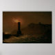 Un gran faro arde ferozmente contra la oscuridad de la noche, las llamas saltan al cielo y se reflejan en el agua de abajo. Los barcos se apresuran hacia el incendio mientras las figuras en la orilla observan horrorizados y sobrecogidos. El humo corre a través de las estrellas, y el océano brilla con la espeluznante luz del desastre.