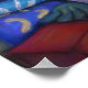 The person appears to wear a small cardinal red vest. Their left side of their body appears to have bright Maya, cobalt and cornflower blues, with the lighter blues forming five petal flowers. On the right side of the body there is a white and seashell patch with orange and yellow flowers. The rest of their face and body is muted burgundy, rust, burnt and pumpkin oranges. The person is sitting on a deep green pillow on a vermillion, auburn and fire brick red rectangle bench.