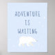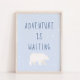 Nieve azul dulce de invierno con la frase "Adventure is wait", la naturaleza explorar y aventurar el oso polar perfecto para guarderías infantiles, habitación infantil, dormitorio, sala de juegos y otra habitación. texto personalizado y color monograma y fondo. Diseño neutral de género para niños y chicas.
