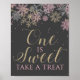 Invierno de Onederland Uno es dulce, tómate un trato, el signo de la fiesta de primer cumpleaños con copos de nieve rosados y dorados.