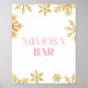 Invierno de Onederland primer cumpleaños Mimosa bar cartel con texto rosa y copos de nieve dorados.