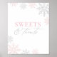 Invite a sus amigos y familiares a disfrutar de un aperitivo en la fiesta de cumpleaños de su pequeña persona con este cartel temático de la 'Tierra de Invierno', con copos de nieve rosas y plateados.