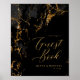 Un fondo abstracto que recuerda al mármol en tonos de gris carbón a negro, con un brillante oro, es el telón de fondo de un texto de escritura elegante y de diseños modernos en las piezas de esta hermosa suite boda. El signo del boda que se muestra aquí presenta el texto de guión de arriba más el texto opcional de "Libro de invitados" y una plantilla para añadir los nombres de la novia y del novio y la fecha del boda. Buscar ID644 para ver todas las piezas de coordinación de este conjunto.