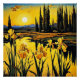 La A.I. creó la interpretación de los vivos colores amarillo y oro dominan el paisaje, donde altos cipreses bordean el río bajo un cielo atardecer. En primer plano, un grupo de flores de iris se exhibe de forma destacada, y su reflejo se ve en las aguas tranquilas de abajo.