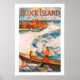 Vintage poster de viajes para la nueva isla inglesa Block Island, una estación de verano en la costa de Connecticut.