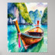 Esta imagen muestra una pintura acuarela de un barco largo flotando a través de las islas Phi Phi en Tailandia.