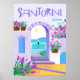Isla Santorin Grecia Hermosa arquitectura blanca tradicional e iglesias ortodoxas griegas con cúpulas azules y flores Piscina con chica Viajes, ilustracion de vacaciones
