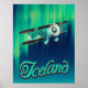 Afiche de viaje de estilo vintage de Islandia de las auroras boreales y un avión ligero que vuela por delante.