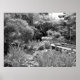 Black and white photograph of a garden pond with a wooden bridge and a water wheel. This pretty scene is just part of a beautiful temple garden in Kanagawa, Japan.