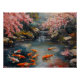 Este cuadro representa un tranquilo jardín japonés con un sereno estanque de koi rodeado de exuberante vegetación y vibrantes flores de cerezo. Una suave cascada se adentra en el estanque, donde los coloridos peces koi desfilan con gracia a través del agua. Los pétalos rosados delgados flotan en la superficie, lo que añade un ambiente tranquilo y meditativo. Los árboles y el follaje de los alrededores combinan armoniosamente tonos cálidos y fríos, lo que realza la belleza de este refugio idílico. La escena refleja un equilibrio perfecto entre la naturaleza, el movimiento y la tranquilidad, que evoca una profunda sensación de calma y serenidad.