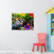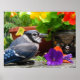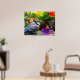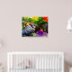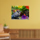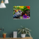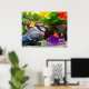 Este poster colorido cuenta con un muelle azul que ha desembarcado en una terraza porche rodeada de flores. La coloración azul, gris, blanco y negro del pájaro se ve empañada por un revuelo de color. Hay una tetera decorativa con nasturtios naranjas y amarillos y una petunia violeta. Las hojas verdes completan este caleidoscopio de colores.