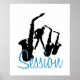 Sax formando la palabra "J(a)zz" con saxofonista para A. Diseño negro con "Sesión" azul palabra sobre fondo blanco (personalizable). Personalizable poster. Puede agregar fácilmente texto (fuente, color, tamaño y posición) haciendo clic en el botón personalizar o personalizar.