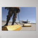 Un jefe de la tripulación de la Fuerza Aérea de los Estados Unidos espera marcar el vuelo de un avión que se exhibe con un avión.
