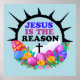 Jesús es la Razón - Pascua, este diseño presenta una corona floral de Pascua con flores y huevos de Pascua y una corona de oraciones así como texto que dice: "Jesús es la razón".