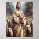 Esta sincera representación de Jesús como el Buen Pastor irradia paz y compasión. En el centro de la escena, Jesús aparece en una vista de tres cuartos, vestido con una bata blanquecina que corre. Su cabello marrón claro, su cutis bronceante y su barba reflejan su humilde naturaleza y calidez. Sujetando un cordero suavemente en Su brazo y llevando el personal de un pastor, Jesús guía a su rebaño con amor y cuidado. El entorno es tranquilo y cuenta con un exuberante paisaje pastoral de colinas verdes onduladas, un follaje vibrante y ovejas esparcidas en diferentes tonos de marrón claro y bronceado. Un cielo azul suave con nubes dispersas contribuye a la serenidad, complementada con una luz difusa que crea un ambiente agradable. Rica en colores y detalles, esta obra de arte se inspira en pinturas religiosas tradicionales. Transmite un mensaje atemporal de fe, protección y conexión de Jesús con Sus seguidores. Ya sea exhibida en un espacio de culto o obsequiada con alguien que busca inspiración espiritual, esta pieza sirve como un recordatorio visual del inquebrantable amor y guía del Pastor.