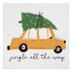 Este diseño muestra un auto amarillo que lleva un árbol de Navidad atado a su techo, rodeado de copos de nieve cayendo. El coche tiene manchas de nieve sobre él, lo que añade a la acogedora atmósfera de invierno. Debajo del auto, la frase "jingle todo el camino" está escrita a mano y juguetona.