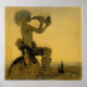 Un niño gigante sopla un cuerno en un pequeño paisaje como lo ilustra John Bauer.