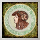 La imagen central de este diseño es una hermosa mujer, parte de una serie de vidrieras creada para la fachada de la tienda Fouquet. Las obras de Alphonse Mucha a menudo presentaban a hermosas mujeres jóvenes vestidas con un aspecto vagamente neoclásico, y sus vestidos, a menudo rodeados de flores exuberantes que a veces formaban halos detrás de sus cabezas. He creado el fondo usando un patrón floral vintage con adornos art nouveau, realzado a través de varias técnicas digitales.