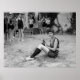 Vieja foto de un joven chica bonito en la playa vestido con traje de baño de los años 20, sosteniendo un muñeco que no parece feliz. Bonita imagen de moda de los años 20.