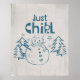A cute, playful doodle like illustration of a snowman surrounded by tree and a text, that says "Just Chill".