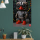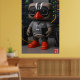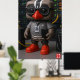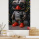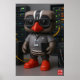 Kagu trabajando en el centro de datos. Esta imagen es de una estatuilla estilizada parecida a un pájaro de Yanbaru. Está vestido con un atuendo que sugiere un personaje experto en tecnología, con una camisa de polo gris, pantalones cortos negros con un patrón ondulado en el dobladillo, y zapatos rojos brillantes. La estatuilla tiene gafas gruesas con bordes negros y un patrón rayado en blanco y negro sobre la cabeza, que se asemeja a un peinado. Lleva una tableta negra en la mano izquierda y un patio con una placa alrededor del cuello. La figura está parada en lo que parece ser una sala de servidores o un centro de datos, con racks de luces parpadeantes visibles en el fondo. El estilo general recuerda a la figura del ave yanbaru kuina de okinawan gracias a su gran cabeza y su pequeño cuerpo, aunque esta tiene una textura más realista. En la esquina inferior derecha de la imagen, hay un sello rojo con lo que parecen caracteres japoneses.