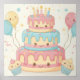An ultra-sweet and festive design illustrated in the Japanese Kawaii style. The pattern features a smiling three-tier birthday cake with candles, surrounded by balloons, small cupcakes, and stars. The color palette is soft and pastel (pink, blue, and light blue), creating a joyful and childlike atmosphere. This design is perfect for party supplies, greeting cards, children's packaging, and any item meant for a birthday celebration