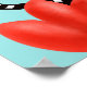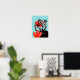 Un poster monstruo lindo con una criatura personalizado negra con cuatro ojos en los tallos largos rayados blancos y negros sonriendo, escondido en tulipanes rojos abstractos.