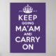 Keep Going Ma’am and Carry On Poster Crown motif notated 1952-2012 with plain text slogan Keep Going Ma’am and Carry On over luxuriant Vintage Royal Purple background. We think this is the best, most succinct Diamond Jubilee design out there. An original design in homage to the ubiquitous 1939 HMSO poster Keep Calm and Carry On. This year we celebrate 60 years since Queen Elizabeth II ascended to the throne in 1952 with a year of celebrations up and down the length of our green and pleasant land focussed on the Diamond Jubilee weekend 2nd to 5th June 2012 and the London 2012 Olympics. Capturing the collective feelings of our island nation and the greater Commonwealth. While others may seek to splinter our United Kingdom we say frustrate their knavish tricks and thank you Ma’am for your dutiful service through thick and thin, far and wide - may this truly be your annus mirabilis. Long may you reign over us - God Save the Queen!