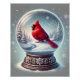 Un cardenal rojo vibrante encaramado dentro de un globo de nieve ornamentado, rodeado por un paisaje de invierno helado con árboles nevados y delicados copos de nieve.