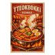 Travel poster featuring Korean Tteokbokki in a bold retro street-food style. Central illustration of chewy rice cakes simmered in spicy red gochujang sauce, fish cakes, boiled eggs, and scallions, served in a street food pan. Steam rising to create a lively atmosphere. Vibrant color palette: chili red, warm orange, cream, deep brown. Subtle grain texture, strong graphic shapes inspired by vintage travel posters. Add bold retro typography: “TTEOKBOKKI – KOREA”. Vertical 2:3 layout, high-resolution, print-ready.